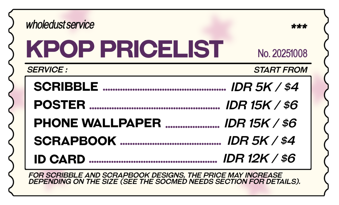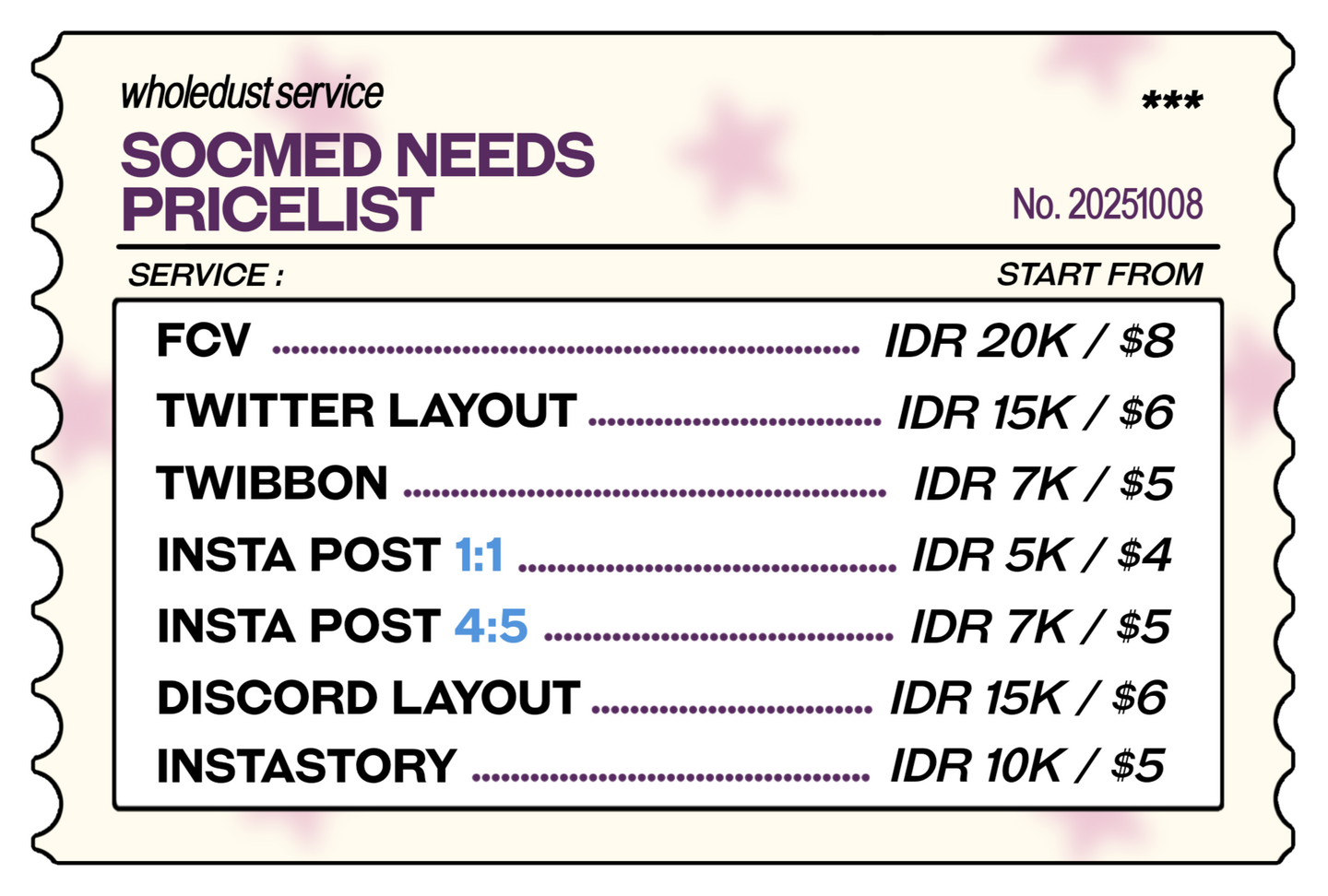 Major revisions cost $4 / Rp5K—7K. (ex. Changing the main pic after the design is done, completely altering the layout or concept, changing the overall style, etc)